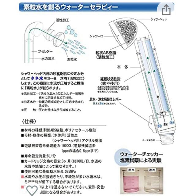 「ウオーターセラピイー」は繊維活性炭で残留塩素を低減及び除去しますので、赤ちゃんのお肌にも安心してお使いいただけます。